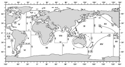 W celu skoordynowania transmisji ostrzeżeń dalekiego zasięgu (nadajniki systemu NAVTEX mają zasięg ok. 200 NM), świat został podzielony na 16 obszarów NAVAREA. Granice tych obszarów przedstawione zostały na rysunku 2.15.